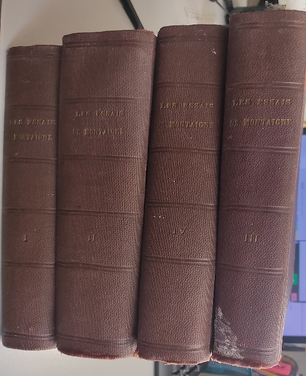 pp.XXII,475,(3); X,668,(2); X,473,(3); LXXXIII,(1),484,(2), 2 facsimile protetti da velina di cui uno a col., rilegature coeve uniformi in mezza tela, titoli in oro ai dorsi. Esemplare privo soltanto del t. V e ultimo, contenente un "Lexique de la langue des Essais" e un "index des noms propres".