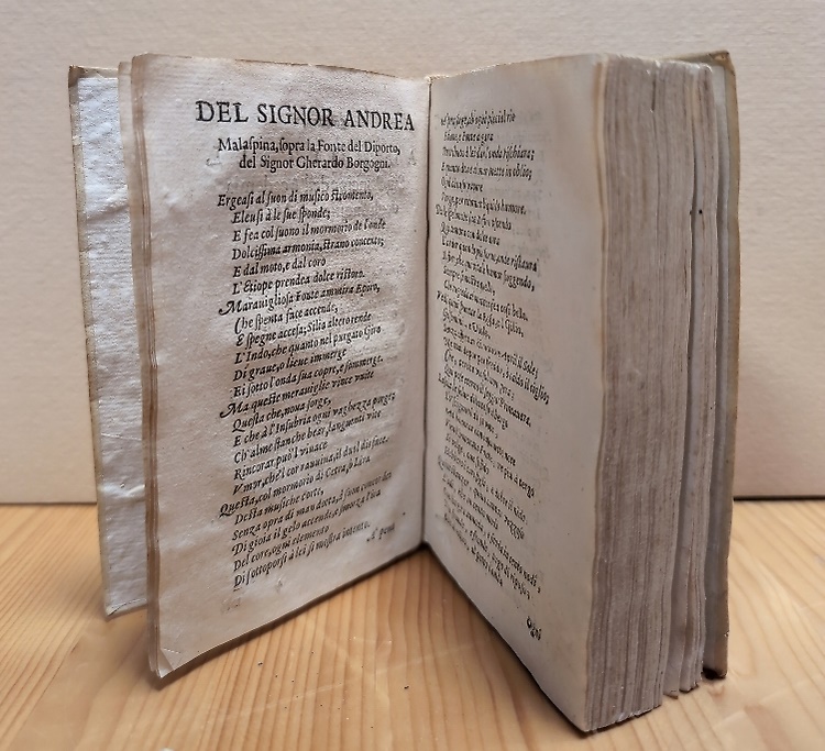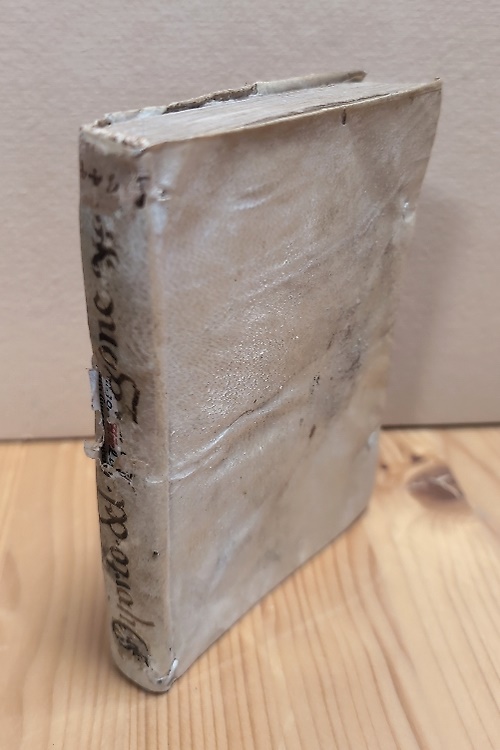 Details: In 8, cm.9,5x14,5, una carta bianca, 8 carte non numerate, pagine numerate 256 (in realtà 254 perché è saltata la numerazione delle pagine 96-7). Legatura coeva in piena pergamena molle con lacci (assenti), dorso (piccole mancanze di pergamena) con titolo in inchiostro marrone.