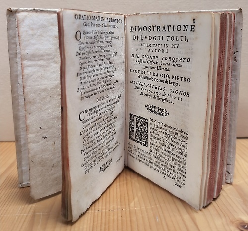 una carta bianca, probabilmente foglio di sguardia aggiunto dal legatore, 8 carte non numerate, 274 pagine pagine numerate, 2 carte non numerate. Legatura secentesca in piena pergamena rigida, titolo in oro al dorso su tassello in pelle marrone, tagli colorati; vari forellini di tarlo alla legatura, specialmente al dorso che affettano anche le ultimissime e primissime pagine, in maniera però assai minimale e senza nessun danno al testo, firme al frontespizio. Copia nitida e marginosa, bella