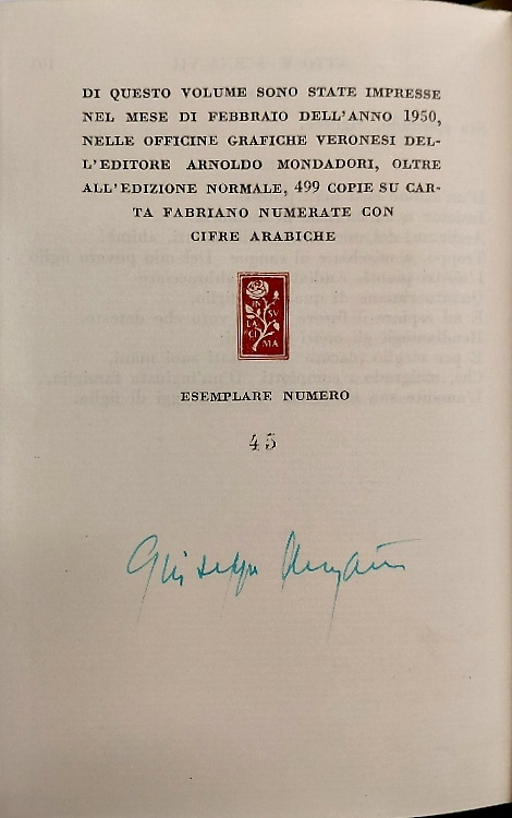 Con l'apparato critico delle varianti di tutte le poesie e uno studio di Giuseppe De Robertis. Milano, Arnoldo Mondadori Editore 1945, cm.13x19,5, pp.256, brossura, cop.fig. a colori. Collana Lo Specchio - I Poeti del Nostro Tempo. Prima edizione.