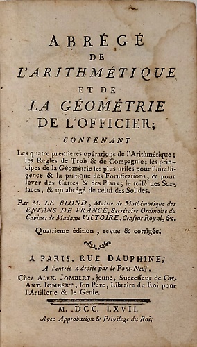 Abrege de l'arithmetique et de la geometrie de l'officier. Contenant les quatre premieres operations de l'arithmetique; les regles de trois et de compagnie. Les principes de la geometrie les plus utiles pour l'intelligence et la pratique des fortifications; et pour lever des cartes et des plans; le toise des surfaces et un abrege de celui des solides.
