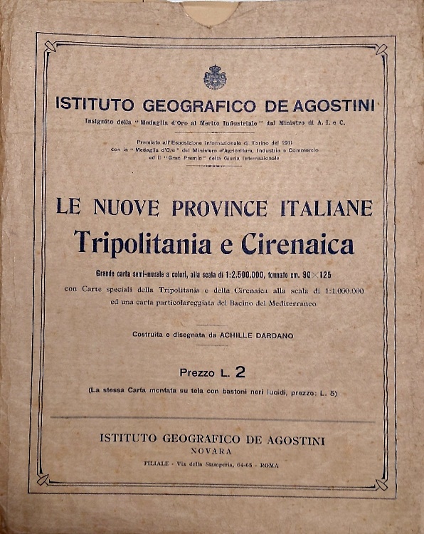Details: cm.90x125, Con carte speciali della Tripolitania e della Cirenaica alla scala di :1.000.000 ed una carta particolareggiata del bacino del Mediterraneo. Costruita e disegnata da Achille Dardano.
