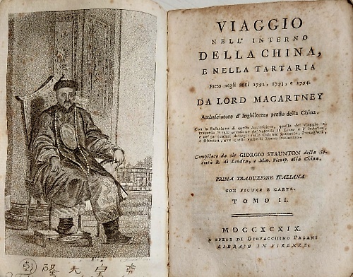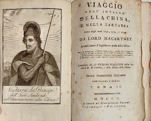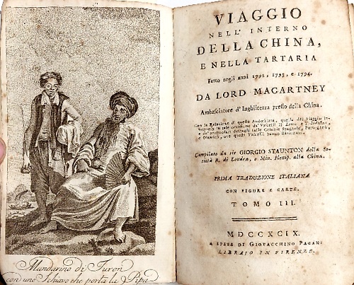 Viaggio nell'interno della China, e nella Tartaria fatto negli anni 1792, 1793, e 1794. Da Lord Macartney Tomo I: pp. XII, 172 [1] carta di tavola, ritratto dell'autore in antiporta.Tomo II: pp.[2], 168 [1] carta di tavola del Grande Imperatore.Tomo III: pp. 200 [1] carta di tavola del Mandarino di Turon.Tomo IV: pp.[2], 190 p., [1] carta di tavola del Vestiario dei principi dell'Isole Sandwich nell'America vicino alla China.Tomo V: pp.171, [1! p., [1! carta di tavola del Nettuno Chinese.Tomo VI: pp.193 [1] p., [2] carta di tavola del tempio o pagot dei chinesi a Pechino., [4 carte di tavole ripiegate, 1) Pico di Tenerife. 2) Carta geografia della parte settentrionale dell' Impero Chinese. 3) carta sulla quale è delineato il giro de vascelli il Lion e l'Indostan dall'Inghilterra fino al Golfo di Pechino e nella China e dal Golfo di Pechino fino in Inghilterra, col Barometro e il Termometro, segnati i confini dell'Impero della China alle conquiste fatte dall'Imperatore Tchien Lung. 4) La tartaria Chinese. A seguire nel sesto volume: Appendice al viaggio di Lord Macartney.