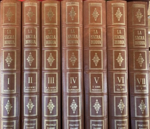 Edizione integrale ill.con le miniature de «La Bible de sens» del sec.XIV e la riprod.della Historia del Nuovo Testamento, miniata da C.De Predis nel 1476. Torino, S.A.I.E. San Paolo 1980, 3 volumi cm.23,5x31,5, pp.XXVIII-614,VIII-604,VIII-484, 5 ca.contenenti l legature editoriali nervi, scritte e fregi in oro ai dorsi.