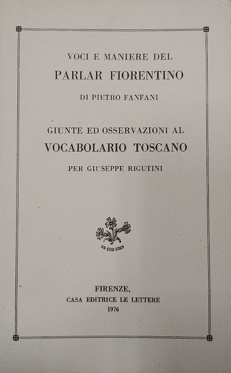E' riproposta una ormai rara edizione del 1868 intitolata Una casa fiorentina da vendere, frutto minore e quasi dimenticato di uno dei più grandi studiosi ottocenteschi della lingua italiana, Pietro Fanfani. Fanfani immagina "che in Firenze ci sia una casa da vendere, la quale minutamente descrivo tutta quanta, per avere occasione di nominare gli oggetti più usuali di tutte le case, mettendo in carattere corsivo le voci significative di essi oggetti". Tutte le voci in corsivo ricorrono poi nella seconda parte del lavoro in ordine alfabetico con la definizione e, spesso, alcune considerazioni. Era questo glossario, per il Fanfani, il contributo più¹ significativo dell'intero lavoro il cui destinatario erano gli alunni delle scuole e i loro insegnanti. Questa riedizione integrale offrirà invece al lettore di oggi materiale originale per ricostruire uno spaccato della vita quotidiana fiorentina di centocinquanta anni fa, anche e soprattutto attraverso il lessico proposto. Il libretto godette all'epoca di una certa notorietà , tanto da giungere nel 1897 alla quindicesima edizione. L'edizione proposta segue fedelmente la prima stampa, tirata nel 1868 presso la tipografia fiorentina all'insegna di Sant'Antonino, che reca sul frontespizio la dicitura "libretto per le scuole". Le immagini scelte per illustrare il quaderno sono databili allo stesso periodo e riconducibili ad architetture e interni fiorentini.