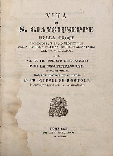 Vita di S. Giangiuseppe della Croce, Promotore, e primo Provinciale della Famiglia Italiana de' Frati Alcantarini nel Regno di Napoli. Scritta dal P. Fr. Diodato dell'Assunta per la beatificazione e ora ristampata dal Postulatore della causa P. Fr. Giuseppe Rostoll in occasione della solenne santificazione.