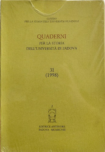 Padova, Editrice Antenore 1996, cm.16,5x24, pp.(2),VIII,310,(2), brossura Pubblicaz. a cura del Centro per la Storia dell'Università di Padova. Elenco degli indici: ## Sommario: --M. CALLEGARI, Giovanni Antonio Volpi editore universitario --V. GIORMANI, Contrasti fra l’Università di Padova e il Collegio dei medici di Venezia nel ’700 --A. BASSANI, La chimica dell’Ottocento nelle istituzioni. Il caso di Francesco Ragazzini (10.1.1799-17.8.1873) --D. LAVEN, Town, Gown and Garrison in Early Nineteenth Century Padua, 1815-1835 --A. VENTURA, L’Università di Padova nella Resistenza ## Miscellanea: --M. BANDINI, Il giurista Francesco Fazi (†1505) prima della docenza universitaria ## Schede d’archivio: --L. BÖNINGER, Il privilegio dottorale ‘in artibus liberalibus’ di Girolamo Policastro (1470) (tav. I) --E. VERONESE CESERACCIU, Una sede dell’università artista (1474-1511) ## Analisi di lavori dell’ultimo decennio: --M. ALBERINI, Breve storia di Michele Savonarola seguita da un compendio del suo «Libreto de tutte le cosse che se manzano» (M. PRALORAN) --A History of the University in Europe. Vol. I. Universities in the Middle Ages, ed. by H. DE RIDDER-SYMOENS (G.P. MANTOVANI) --A. POPPI, Cremonini, Galilei e gli inquisitori del Santo a Padova (F. ZEN BENETTI) --Storia dell’Università di Pisa, I: 1343-1737 (F. PIOVAN) --E. VACCARI, Giovanni Arduino (1714-1795). Il contributo di uno scienziato veneto al dibattito settecentesco sulle scienze della Terra (R. VERGANI) --Die mittelalterliche Handschriften der Universitätsbibliothek Eichstätt. Erster Band, aus Cod. st 1-Cod. st 275, beschrieben von H. HILG (G.P. MANTOVANI) ## Bibliografia dell’Università di Padova: --Bibliografia retrospettiva e corrente ## Iniziative per la storia delle Università italiane. Notiziario: --Copernico e la questione copernicana (Ferrara-Bondeno, 18-20 ottobre 1993) (L. SITRAN REA) --La crisi del regime fascista 1938-1943. La società italiana dal «consenso» alla Resistenza (Padova, 4-6 novembre 1993) (M. FIORAVANZO) --Copernico a Padova (Padova, 10 dicembre 1993) (E. VERONESE CESERACCIU) --Presentazione della miscellanea in onore di Pietro Faggiotto (Padova, 24 gennaio 1994) --L’Università italiana tra medioevo e rinascimento (Pisa, 14-16 aprile 1994) (P. DEL NEGRO) --L’Università di Padova ricorda Charles Patin (4 maggio 1994) (L. SITRAN REA) --La storia delle Università italiane. Archivi, fonti, indirizzi di ricerca (Padova, 27-29 ottobre 1994) (L. SITRAN REA) --Umberto Antonio Padovani. Convegno di studio nel centenario della nascita (Padova, 24 novembre 1994) (A. DA RE) --Carlo Giacon a dieci anni dalla morte (Padova, 14 dicembre 1994) (G. PAIA) ## Fontes: --Presentazione (G.P. MANTOVANI) ## Indici: --Indice dei nomi di persona e di luogo --Indice dei manoscritti e documenti d’archivio