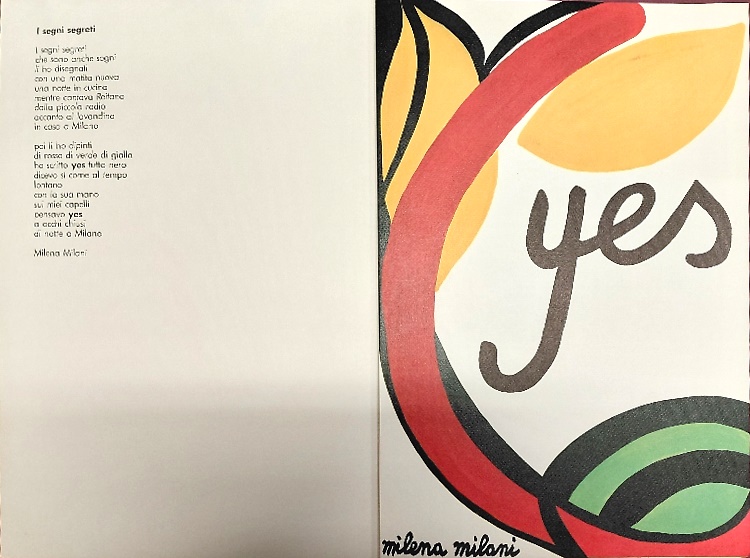 Dettagli: cm.29x44, Cartella con un foglio piegato in due con una poesia di Milena Milani e un foglio sciolto di una fotolitografia a colori dal titolo YES.