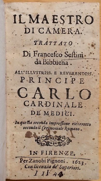 Dettagli: In 12, cm.7,5x14,5, sei carte non numerate (la prima di esse bianca), pagine 200 numerate, una carta bianca in fine. Legatura in pergamena molle coeva, dorso con titolo ormai evanescente, pagine marginose e bianche solo con lievissime macchioline alle primissime ed ultimissime carte. Seconda edizione, ma in parte originale, e con molti cambiamenti rispetto alla prima, edita sempre a Firenze, per lo stesso stampatore, nel 1621.