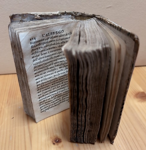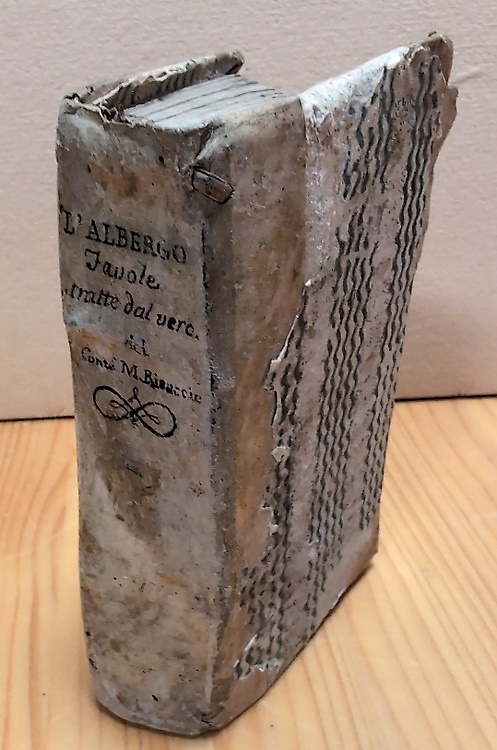 Dettagli: In 12, cm.7,5x14, pagine 538, una carta contenente l’errata corrige (le ultimissime carta con un restauro nella parte laterale alta che non danneggia il testo). Legatura (dorso staccato) coeva in mezza pergamena con punte e piatti marmorizzati, un po’ sbiadita e consunta, dorso con titolo in inchiostro nero in bella calligrafia. Prima edizione della prima opera di narrativa dell’autore, a carattere novellistico, cui segue l’anno successivo un secondo volume. Libro oltremodo interessante per le tematiche e per l’esemplarità dei virtuosismi barocchi. Raro.