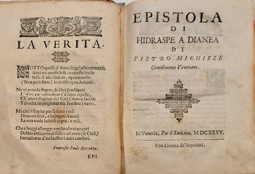 Dettagli: cm.15,5x21, (16) carte non numerate, pp.326,(2), Frontespizio in cornice a doppio filetto, marca editoriale incisa al frontespizio. Marca "donna coronata seduta su leone su lembo terra in mezzo mare tiene scettro e con sinistra getta in mare anello. Cornice. Motto: Potens ubique merito. Segue dedica a Dominico Da Molino; Lo stampatore a chi legge; La verità, sonetto di Francesco Paolo Speranza; dopo queste carte preliminari segue: Epistola di Hidraspe a Diana di Pietro Michiele gentilhuomo venetiano (1635). legatura coeva cartonata, titoli al dorso.