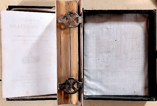 Dettagli: cm.8,5x12, pp.475, 2 tavole in cromolitografia e numerose incisioni anche a piena pagina in bn. protette da velina. bella legatura costituita da due placche e un dorso rigido probabilmente in avorio. Sono presenti due fermagli metallici. I l piatto anteriore è sagomato con motivi geometrici. I tre tagli sono dorati. Contenuto nella sua scatola originale cartonata.