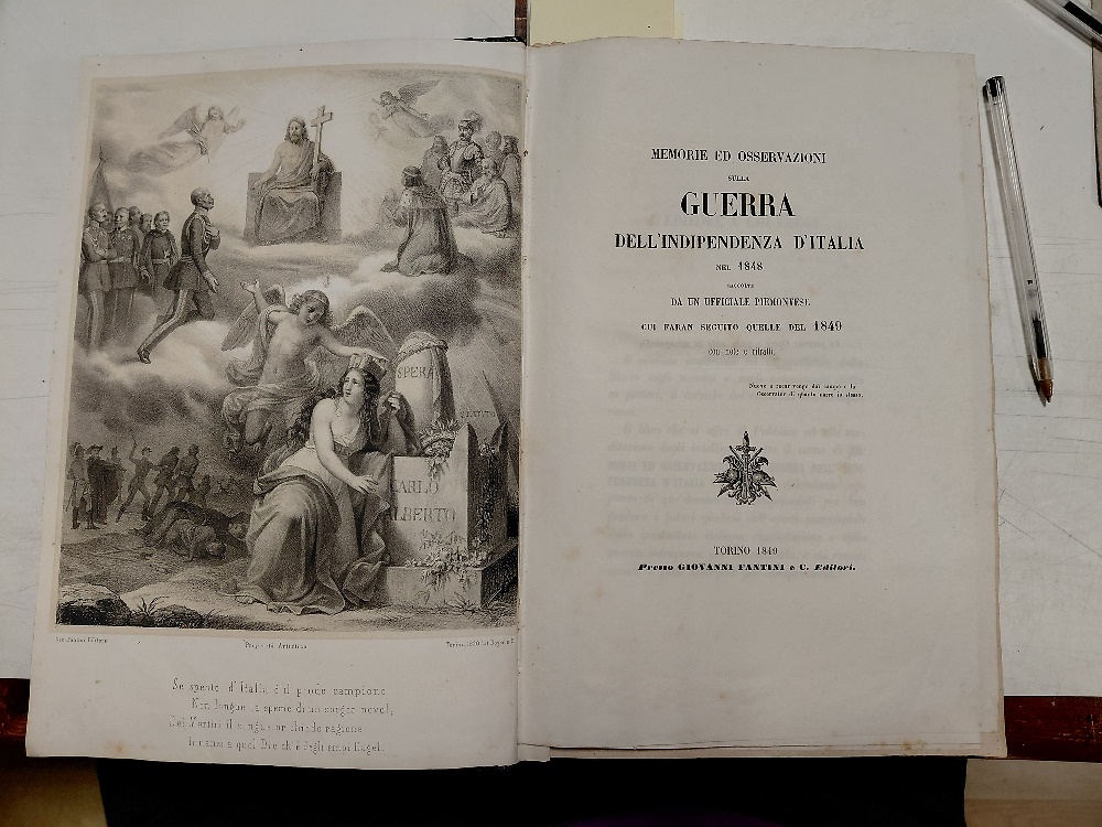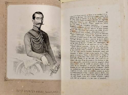 Dettagli: cm.18,5x28, pp.XXIV,396, 25 incisioni di cui 24 ritratti e una bella antiporta incisa, Gio. Fantini Editore e Lit. Doyen e.C. , 3 fogli ripiegati con l'ordine di battaglie e dislocamento delle truppe. rilegatura in mezza pelle, con titoli in oro al dorso. Il testi di Carlo Alberto occupa le pp. 1 - 214. a seguire Documenti inediti.