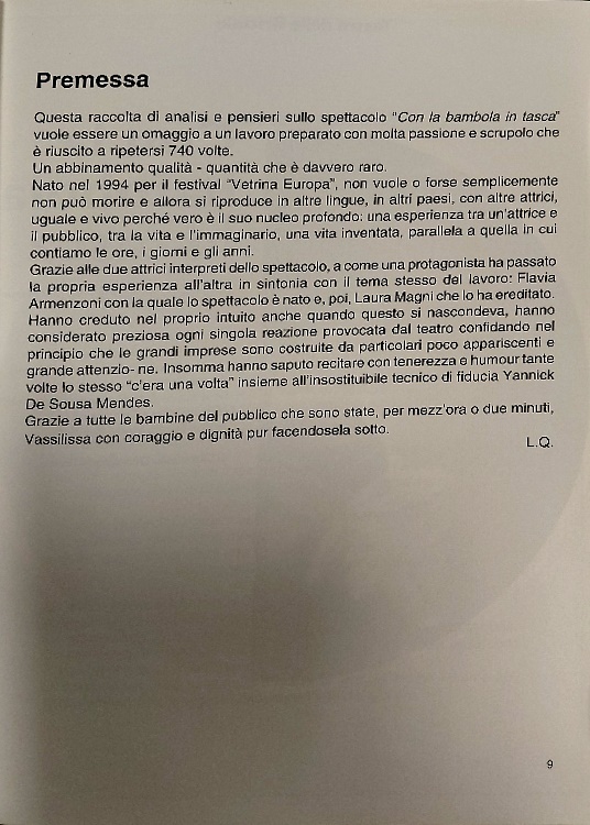 Abstract: Raccolta di analisi e pensieri sullo spettacolo "Con la bambola in tasca." Un omaggio a un lavoro teatrale andato in scena 740 volte. Nato nel 1994 per il festival "Vetrina D'Europa".