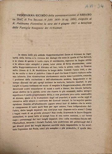 Dettagli: cm.18x25,5, pp.XVI,287,LVI, frontespizio inciso brossura originale, al piatto titoli incorniciati. Testo su due colonne, esemplare in barbe, In aggiunta un opuscolo " Programma ricordo della rappresentazione di Abramo ed Isac di Feo Belcari, 1917 Politeama Fiorentino. Bell'esemplare.