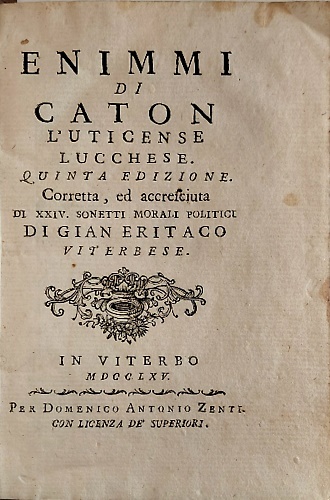 Enimmi di Caton l'Uticense lucchese. Quinta edizione. Corretta, ed accresciuta di XXIV Sonetti Morali Politici di Gian Eritaco Viterbese.