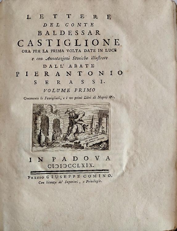 Dettagli: Due volumi. cm.19x26, in 4. pp. XII, 222 (2); XII, 384, Con marchio cominiano ai frontespizi e fregi tipografici nel testo. legature cartonate coeve. Prima edizione delle lettere del Castiglione, data alla luce quasi 250 anni dopo la morte dell'autore. Esemplare estremamente marginoso e in barbe, molto probabilmente su carta grande.