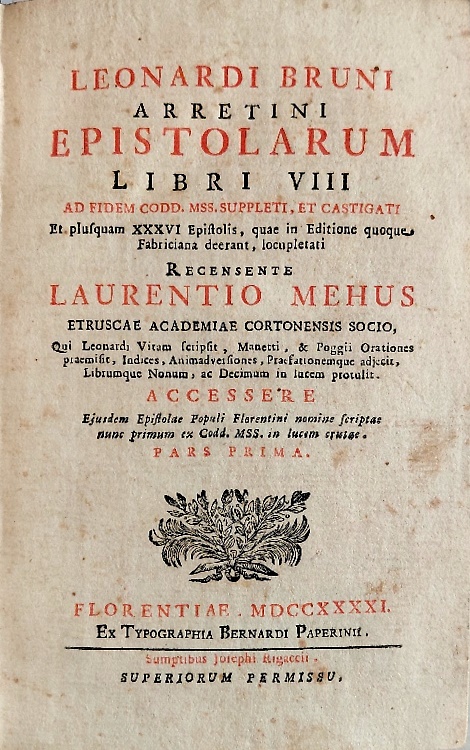 Epistolarum libri VIII ad fidem codd. mss. castigati et plusquam XXXVI epistolis, quae in editione quoque Fabriciana deerant, locupletati recensente Laurentio Mehus... qui Leonardi vitam scripsit, Manetti et Poggii orationes praemisit... Accessere Epistolae populi Florentini nomine scriptae nunc primum ex codd. MSS. in lucem erutae.
