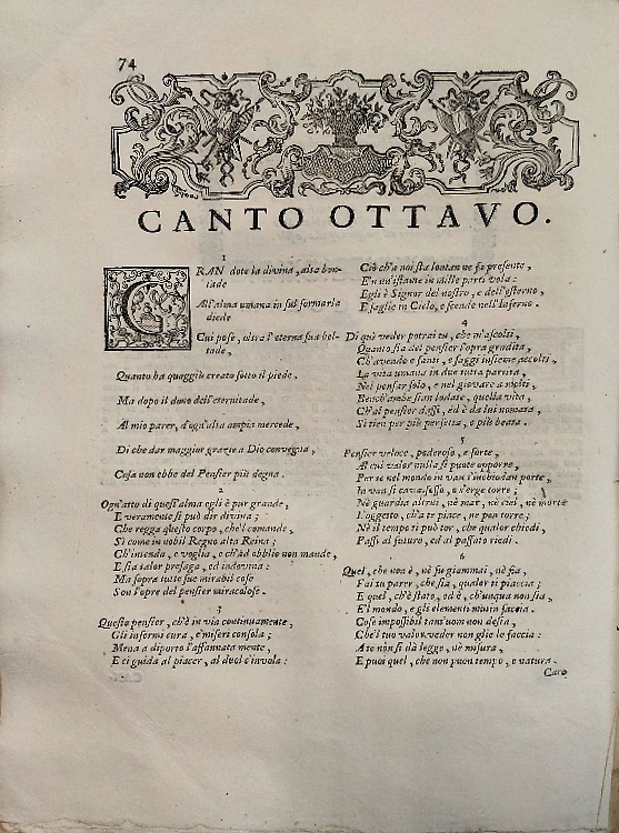 Abstract: Alla carta f4r: Catalogo de' libri stampati da Francesco Piacentini librajo in Venezia.Edizione veneziana di questo noto poema del Tansillo, il poeta venusino legato al Vicerè Pietro di Toledo, rimasto incompiuto al canto XV, e apparso per la prima volta nel 1585 a Vico Equense. Tommaso Costo nel 1606 lo ripubblicò e ne tentò la continuazione. In questa edizione veneziana, preceduta dal titolo Opere di Luigi Tansillo, sono aggiunti al termine, oltre al discorso del Costo, diversi Sonetti e canzoni.