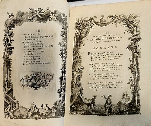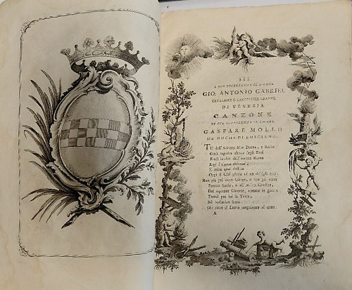 Poesie per l'ingresso solenne di Sua Eccellenza il signor Gio. Antonio Gabriel, cavaliere, e cancellier grande. Bellissimo figurato veneziano per la celebrazione dell'ingresso a Venezia del Gran Cancelliere Giovanni Antonio Gabrielli. Una delle più notevoli opere illustrate tra i "libri di circostanze" pubblicati a Venezia nel XVIII secolo. Le illustrazioni sono meticolosamente incise da Innocente Alessandri e Pietro Scattaglia.