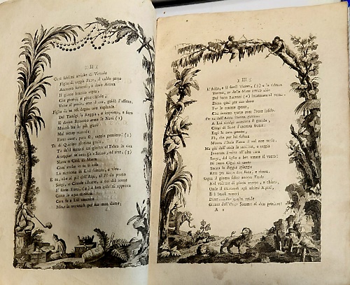 Abstract: Il nostro esemplare molto probabilmente è una variante tipografica. Confrontando con altri esemplari schedati la differenza risulta sulla presenza di pagine iniziali e finali, , forse il tipografo assemblò in corso d'opera esemplari dissimili. Il nostro presenta il frontespizio interamente inciso in rame (graziosi putti sorreggono un drappo entro cui compare il titolo, al verso le armi dei Gabriel entro cornice tipografica. Seguono le 100 carte dei componimenti poetici. Canzoni, sonetti, odi, madrigali, anacreontiche dedicati all'illustre personaggio sono componimenti di D. Florio, L. Godard, G. Pirani, G. Garuffali, A.M. Carminati, B. Giovio e P.A. Novelli. Sono tutti inseriti entro pregevolissime cornici, incise appositamente per quest'opera, raffigurano le civiltà dei quattro continenti: per l'Europa si trovano musicisti, scrittori, pittori e scultori; per l'Asia, studiosi di lingua mandarino; per l'Africa, animali selvatici; infine, per l'America, indigeni sulle coste del Nuovo Mondo. In totale, sono presenti 55 poesie in lode del Gran Cancelliere.