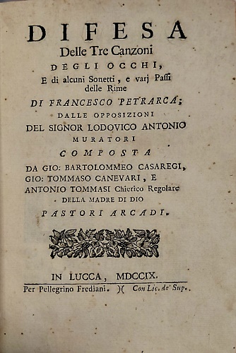 Difesa delle tre Canzoni degli occhi, e di alcuni sonetti, e varj passi delle Rime di Francesco Petrarca; dalle opposizioni del signor Lodovico Antonio Muratori composta da Gio. Bartolommeo Casaregi, Gio. Tommaso Canevari, e Antonio Tommasi chierico regolare della Madre di Dio Pastori Arcadi. [ Angelo Canevari (Roma, 1930), Antonio Tommasi, Lodovico Antonio Muratori, Francesco Petrarca, Angelo Poliziano, Giovanni Lorenzo Berti ].