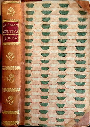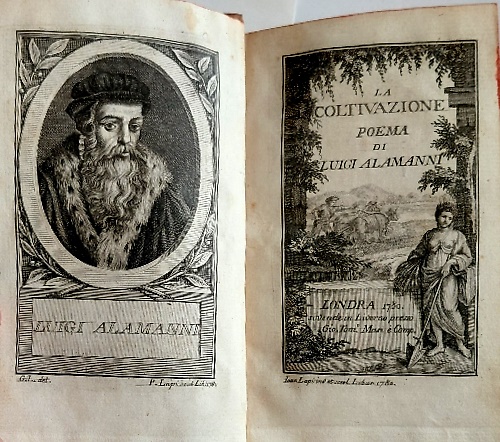 Colle annotazioni del Signor Dottor Giuseppe Bianchini da Prato sopra la Coltivazione, e di Roberto Titi sopra Le Api. Con la Vita dell'Alamanni scritta dal Sig. Co. Giammaria Mazzucchelli bresciano, accademico della Crusca, e con una dotta Lettera del Sig. Giovanni Checozzi vicentino. Bassano, A Spese Remondini di Venezia 1751, cm.11x17, pp.100, 280, rame raffigurante l'Alamanni all'antiporta e frontespizio con bella incisione. frontespizio in rosso e in nero con vignetta in rame (semina, innesto). Iniziali ornate. Testatine e finalini floreali. legatura cartonata con dorso in pergamena. Prima edizione Remondiniana di questi due celebri poemi didascalici. I tre tagli sono colorati. Esemplare pulito e completo.