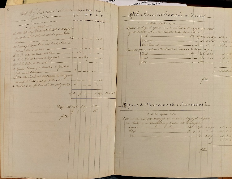 Saldo della Fattoria di Marignolle a tutto Aprile 1850. Libro dei conti originale della Fattoria.DARE/ AVERE : si nota:--Nunziatura della Cappella Apostolo nell' Oratorio della Villa di Marignolle.--Chiesa Prioria di S. Maria a Marignolle.--Entrata dei denari contanti in mano di giovanni Paci agente della fattoria. --Dalla comunità di Legnaia per accolli di strade.--Spese per la casa di Firenze.--A spese di Sughi Pali, ecc.ecc.