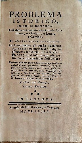 Problema istorico, in cui si domanda; chi abbia più nociuto alla chiesa cristiana; o i Gesuiti, o Lutero e Calvino, in alcuni punti confutato. Lo scioglimento di questo problema scoprirà la vera cagione de' mali, che affliggono la chiesa, ed il Regno di Francia.