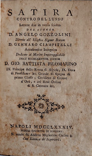Satira contro del lusso : lettere due in verso sciolto del Signor D. Angelo Gozzolini dirette all'illustre signore Barone D. Angelo Ciampitelli accademico incognito dedicate al merito impareggiabile dell'eccellentiss. signor D. Gio: Battista Filomarino IX principe della Rocca di Aspide, IX Duca di Perdifumo & Grande di Spagna di prima classe, cavaliere di Chiave d'oro e Real Ordine di San Gennaro...