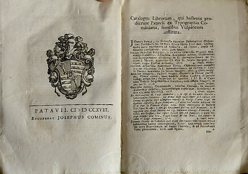 Abstract: In fine : Catalogus librorum, qui hactenus prodierunt Patavii ex Typographia Cominiana, sumtibus Vulpiorum instituta.