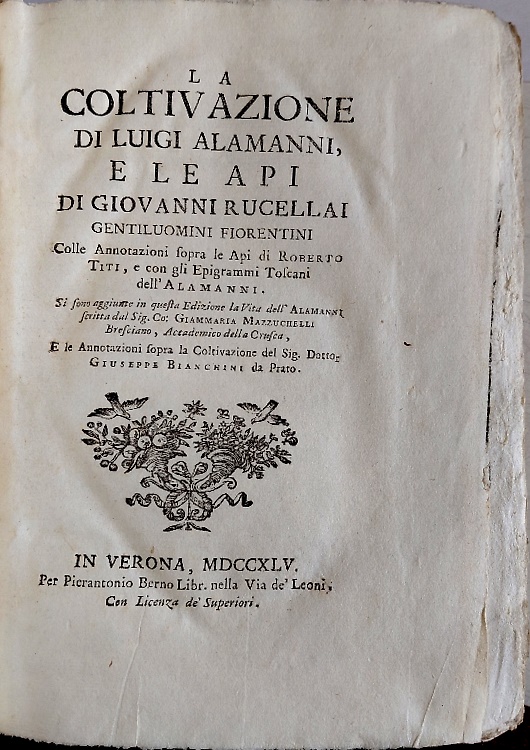 La coltivazione di Luigi Alamanni, e Le api di Giovanni Rucellai gentiluomini fiorentini colle annotazioni sopra le Api di Roberto Titi, e con gli epigrammi toscani dell'Alamanni. Si sono aggiunte in questa edizione la vita dell'Alamanni scritta dal sig. co. Giammaria Mazzuchelli bresciano, accademico della Crusca, e le annotazioni sopra la coltivazione del sig. dottor Giuseppe Bianchini da Prato.