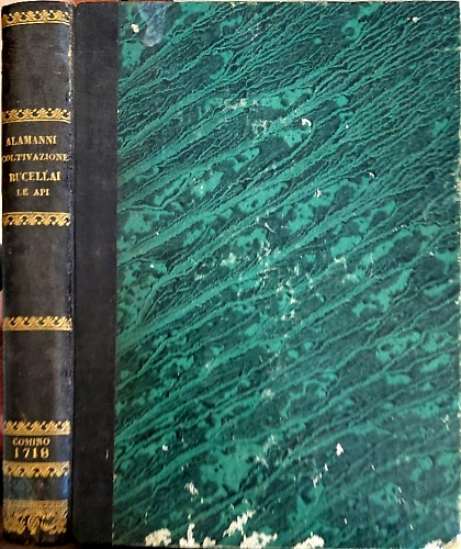 accademico della Crusca, e le annotazioni sopra la coltivazione del sig. dottor Giuseppe Bianchini da Prato. In Verona, per Pierantonio Berno 1745, cm.14x21, In-8, [4], 82, [2], 376, fronterpizio con vignetta, iniziali e fregi xilografici. legatura originale in cartone d'attesa. Con titolo manoscritto al dorso. Mancante della sguardia posteriore, ma buone condizioni complessive. Nota manoscritta di possesso alla sguardia anteriore. Esemplare chiaro e pulito. Edizione settecentesca di due celebri poemi didascalici di argomento georgico composti nel XVI secolo. La Coltivazione" dell'Alamanni, composta in sei libri di endecasillabi sciolti, considerata modello di eleganza e decoro classicistico per gli scrittori del '700. Segue "Le Api" del Rucellai, anch'esso poema d'imitazione virgiliana in cui l'Autore tratta elegantemente di apicoltura. Edizione colle annotazioni sopra le Api di Roberto Titi, e con gli Epigrammi Toscani dell'Alamanni. Si sono aggiunte. la vita dell'Alamanni scritta da Giammaria Mazzucchelli, e le Annotazioni sopra la Coltivazione di Giuseppe Bianchini da Prato.