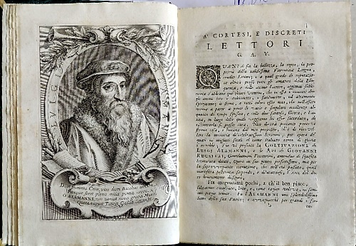 Abstract: Opera che include i poemi didascalici di Luigi Alamanni e Giovanni Rucellai, rispettivamente sulla coltura dei campi e l'allevamento delle api. I due componimenti sono arricchiti dalle annotazioni di Roberto Titi e da una lettera di Giovanni Raimondo Checcozzi in difesa del Trissino. La nostra copia è inoltre arricchita dalla presenza del ritratto di Alamanni.