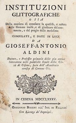 Instituzioni glittografiche o sia Della maniera di conoscere la qualità, e natura delle Gemme incise, e di giudicare del contenuto, e del pregio delle medesime. Segue al frontespizio: Compilate, e date in luce da Gioseff-Antonio Aldini Dottore e Professore primario della più amena letteratura nelle pubbliche Scuole della Città di Cesena, socio dell'Accademia etrusca di Cortona &c. Lettera dedicatoria all'llustrissimo General Consiglio della Città di Cesena.