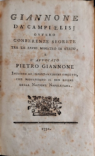Giannone da' Campi Elisj ovvero Conferenze segrete tra un savio ministro di Stato, e l'avvocato Pietro Giannone intorno ad importantissimi obbjetti, che riguardano il ben essere della nazione napoletana.