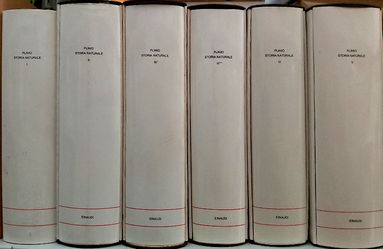 Storia Naturale. I:Cosmologia e Geografia,libri 1-6,pp.LXXIV-848, 14 tavv.a col.ft. II:Antropologia e Zoologia,libri 7-11,pp.710, 14 tavv.a col.ft. III.1:Botanica,libri 12-19,pp.1000, 15 tavv.a col.ft. III.2:Botanica,libri 20-27,pp.912. IV:Medicina e Farmacologia,libri 28-32,pp.646, 8 tavv.a col.ft. V:Mineralogia e Storia dell'arte,libri 33-37,pp.970, 11 tavv.ft.